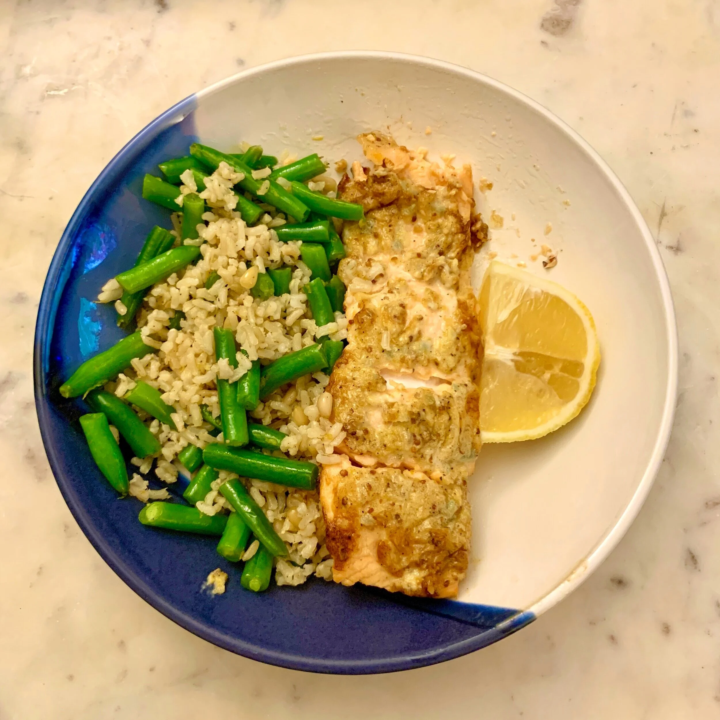We eat this almost once a week - so good, quick, and easy! Shown here with roasted green beans and whole wheat couscous